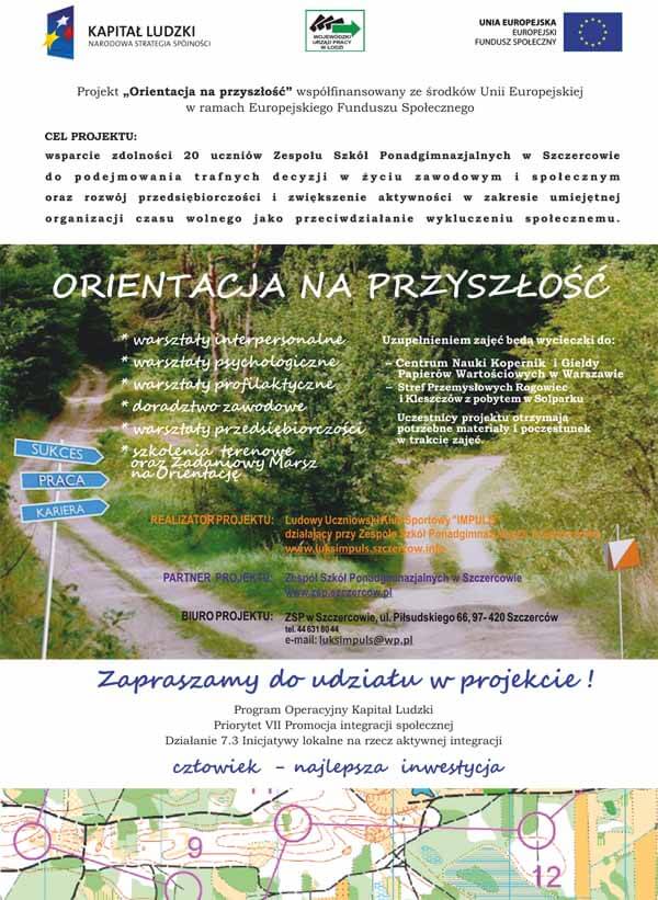 Projekt "Orientacja na przyszłość” realizowany jest w terminie od 1 lutego 2012 do 30 kwietnia 2012 i skierowany do uczniów Zespołu Szkół Ponadgimnazjalnych w Szczercowie. Głównym celem przedsięwzięcia jest wsparcie zdolności 20 uczniów ZSP w Szczercowie do podejmowania trafnych decyzji w życiu zawodowym i społecznym oraz rozwój przedsiębiorczości i zwiększenie aktywności w zakresie umiejętnej organizacji czasu wolnego jako przeciwdziałanie wykluczeniu społecznemu. Planowane działania to: ► warsztaty interpersonalne, psychologiczne i profilaktyczne ► doradztwo zawodowe i warsztaty przedsiębiorczości ► szkolenia terenowe i Zadaniowy Marsz na Orientację. |