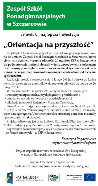 | 10 luty 2012 | Lokalny miesięcznik "Informator Szczercowski" publikuje artykuł dotyczący projektu "Orientacja na przyszłość". zobacz artykuł |