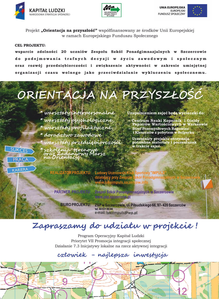 Projekt "Orientacja na przyszłość” realizowany jest w terminie od 1 lutego 2012 do 30 kwietnia 2012 i skierowany do uczniów Zespołu Szkół Ponadgimnazjalnych w Szczercowie. Głównym celem przedsięwzięcia jest wsparcie zdolności 20 uczniów ZSP w Szczercowie do podejmowania trafnych decyzji w życiu zawodowym i społecznym oraz rozwój przedsiębiorczości i zwiększenie aktywności w zakresie umiejętnej organizacji czasu wolnego jako przeciwdziałanie wykluczeniu społecznemu. Planowane działania to: ► warsztaty interpersonalne, psychologiczne i profilaktyczne ► doradztwo zawodowe i warsztaty przedsiębiorczości ► szkolenia terenowe i Zadaniowy Marsz na Orientację. |